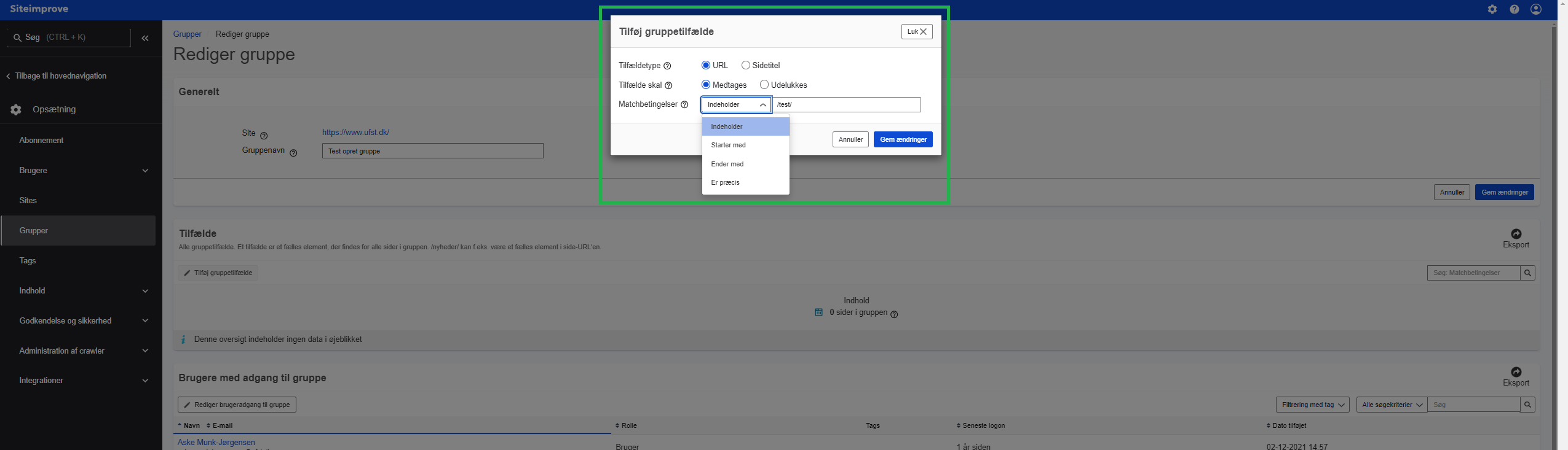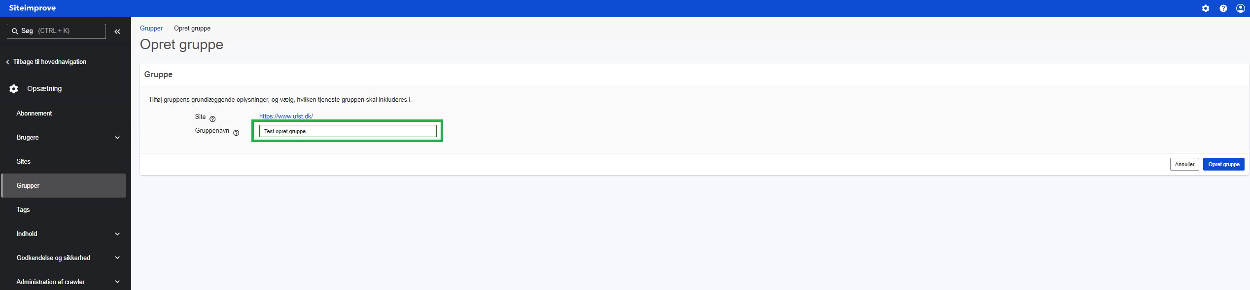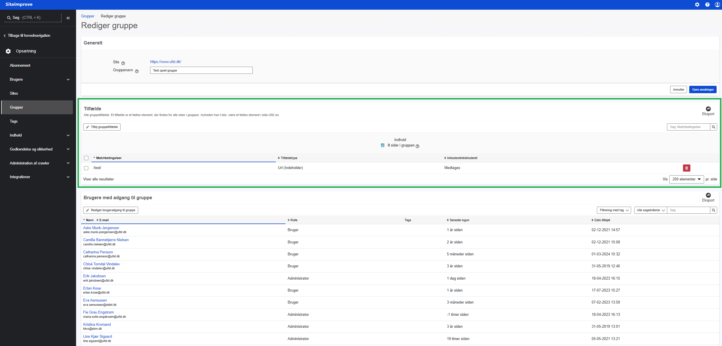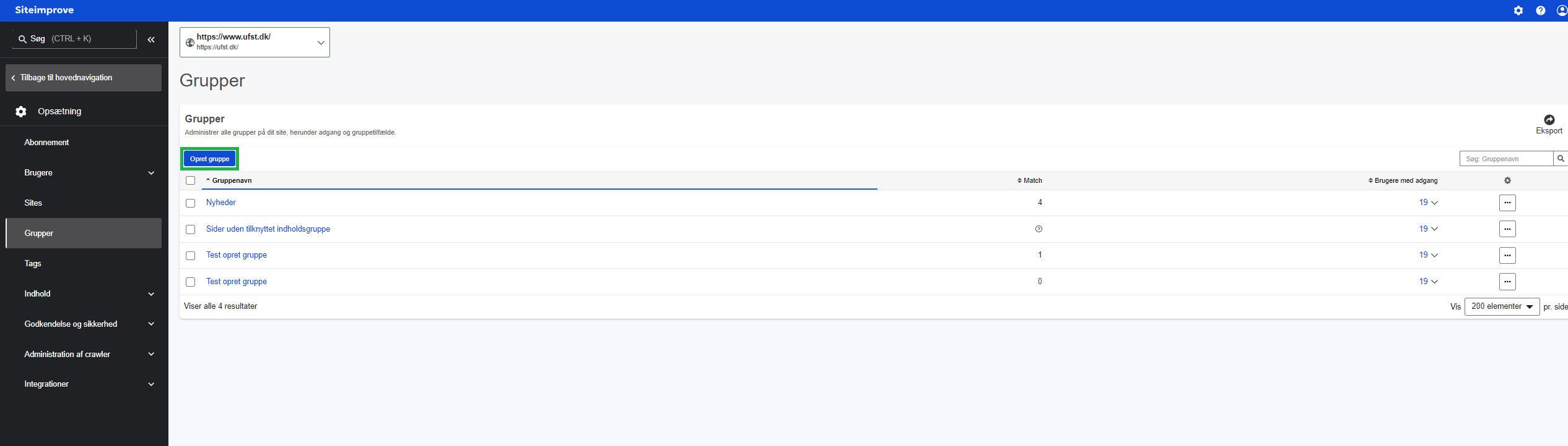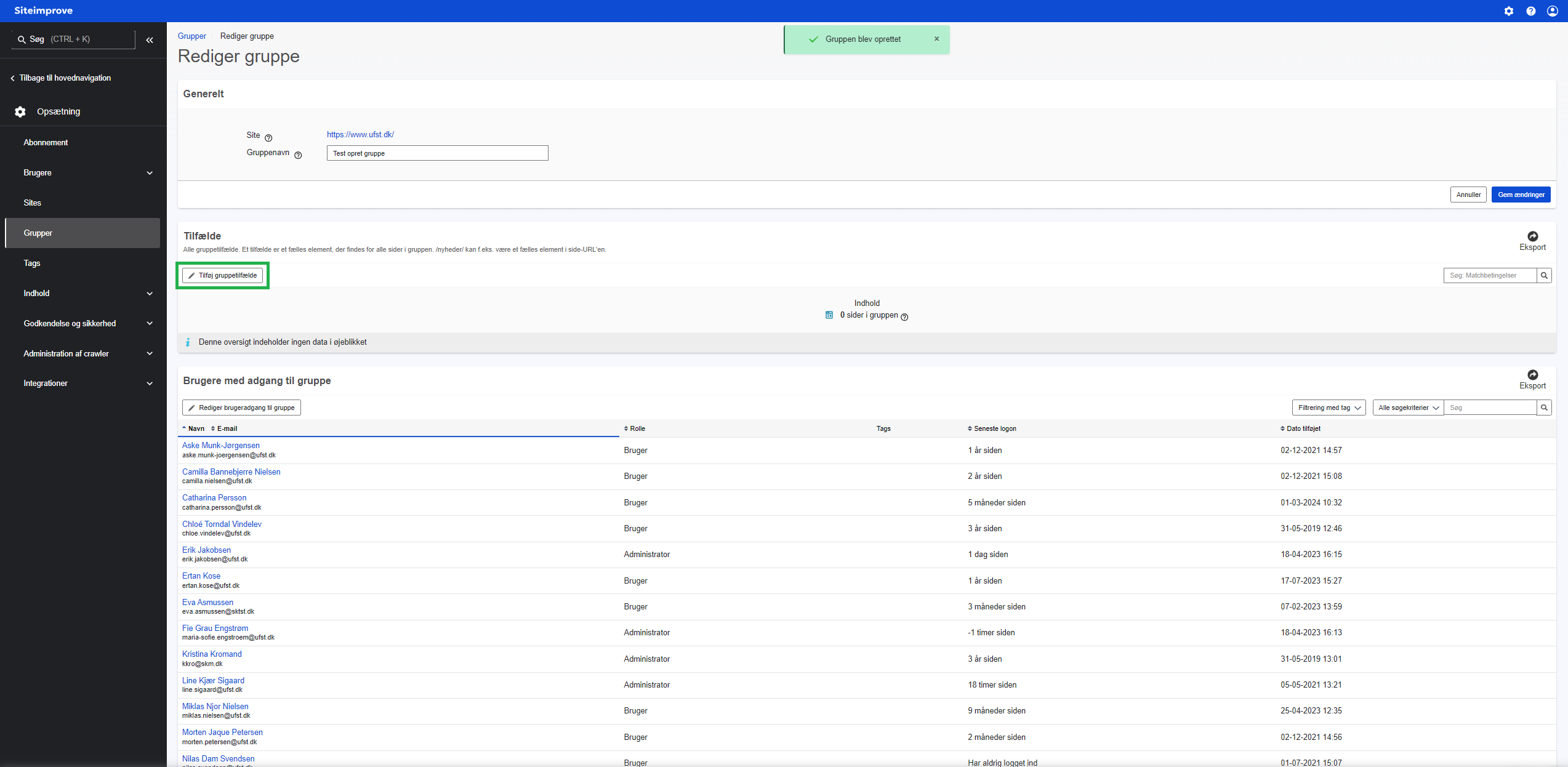 Bemærk, at kun kontoindehaver og administratorer kan oprette og redigere grupper. Hvis du har behov for at få ændret din rolle på Siteimprove, skriv gerne direkte til Maria-Sofie.Engstroem@ufst.dk og alternativt til kontorets fælles postkasse dkd@ufst.dk.