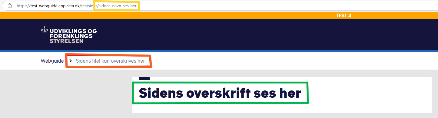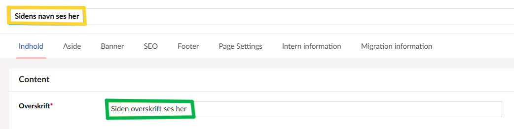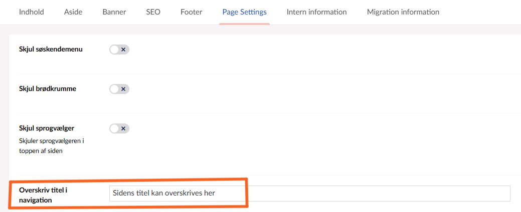 - Desuden kan man overskrive en titel i navigationen. I så fald, vil det være denne titel, der vises i brødkrummen og i transportlinks i stedet for sidens overskrift.