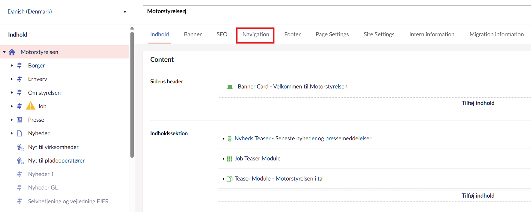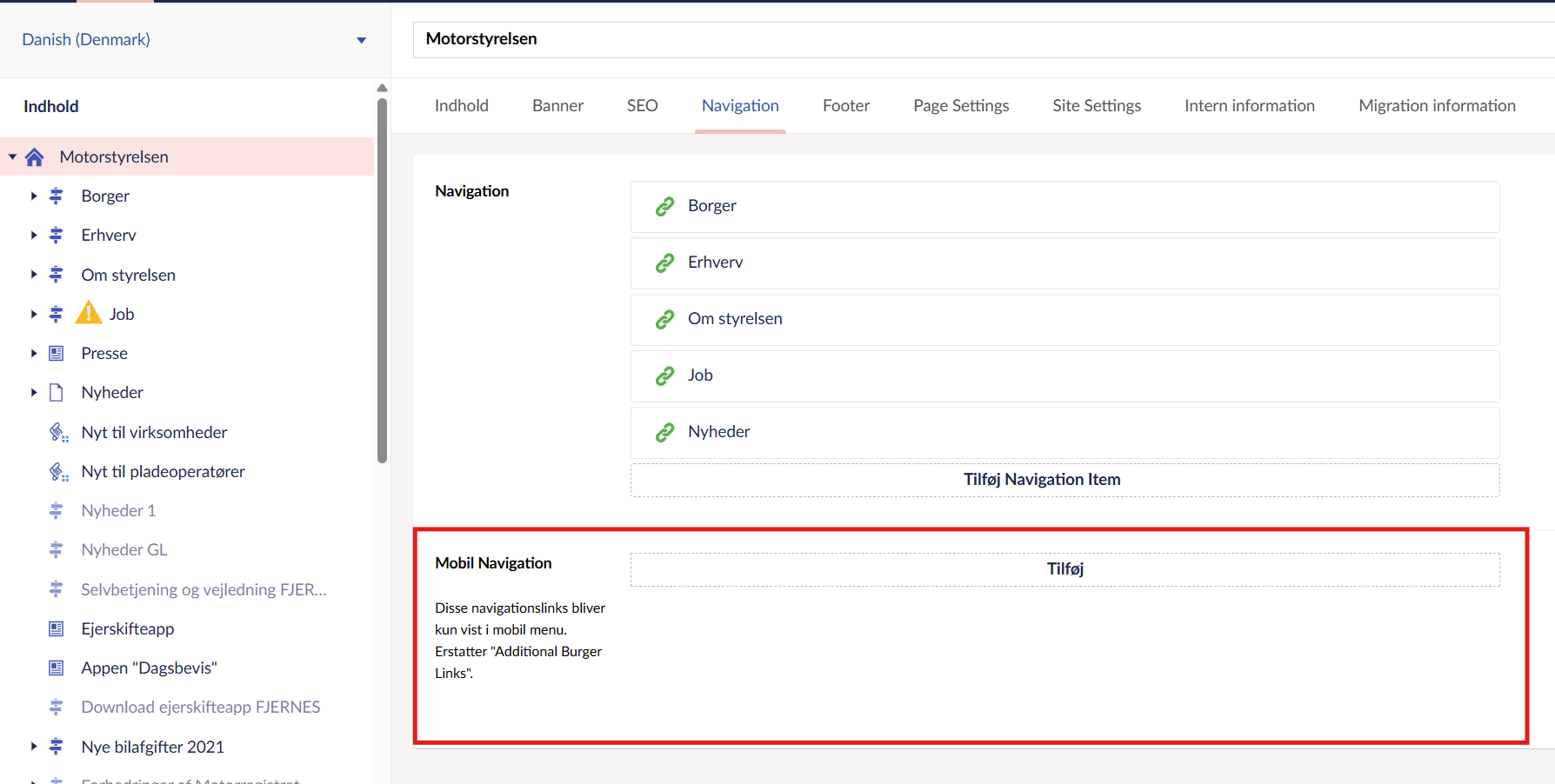 Efterfølgende kan der under Mobil Navigation tilføjes flere links ét ad gangen: