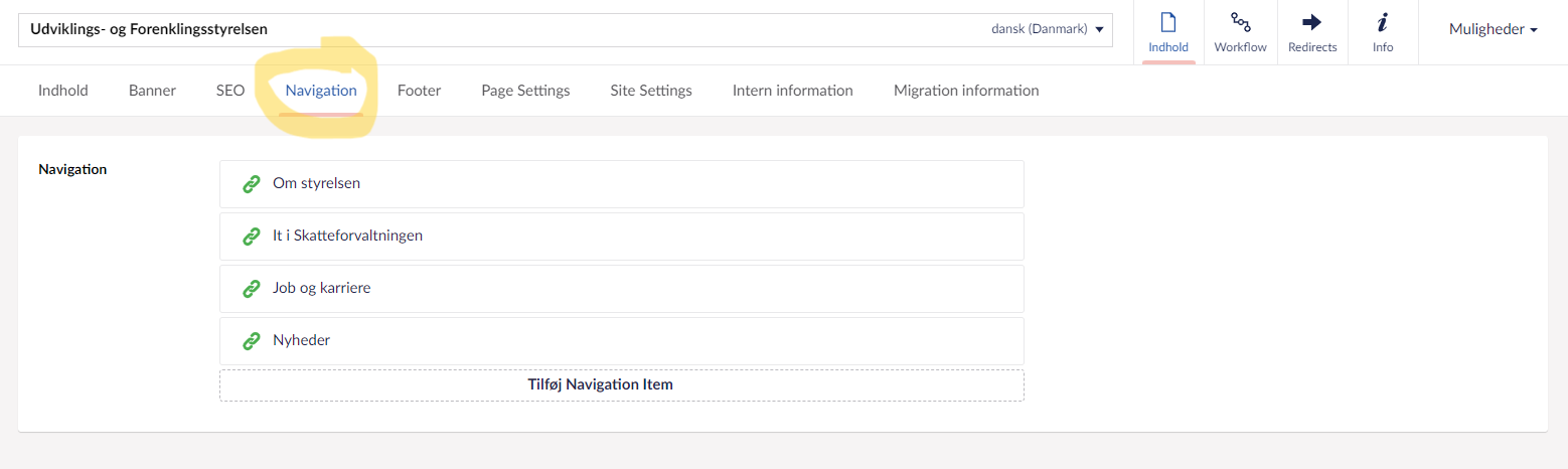 De menupunkter (kaldet navigation item), som skal vises i headeren, tilføjes under 'navigation' på forsiden.