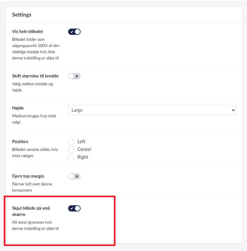 - Her kan du vælge om billedet skal være fuld bredde. Som standard vil det være samme bredde som indholdet på siden.