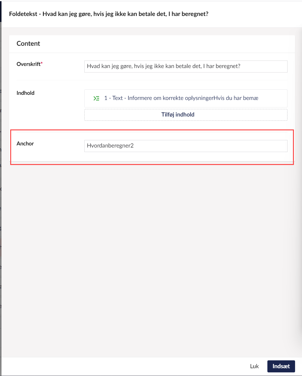 Opret ankerlink det sted hvor der skal linkes til. Der er lidt forskel på om der skal linkes til tekst eller en foldetekst.