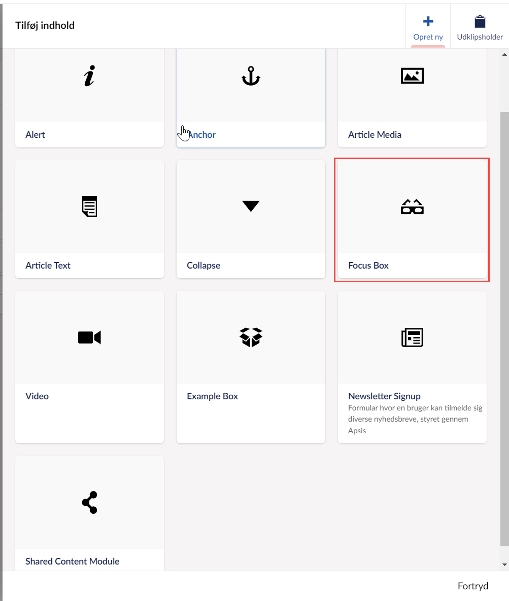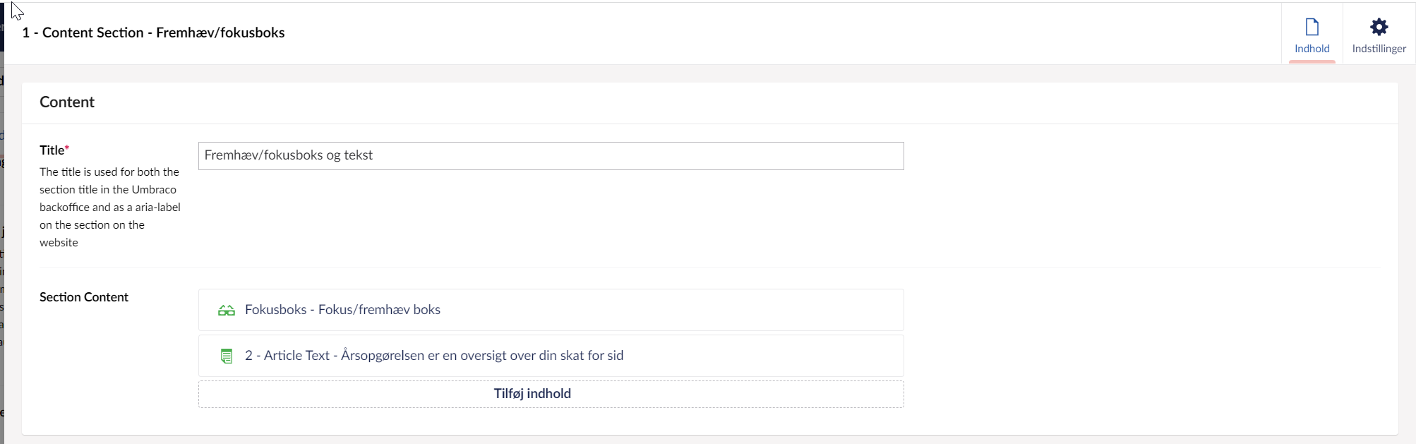Fokusboksen skal ligge i en Content section sammen med den tekst, den skal ligge ved siden af og ikke andet indhold i den content section.