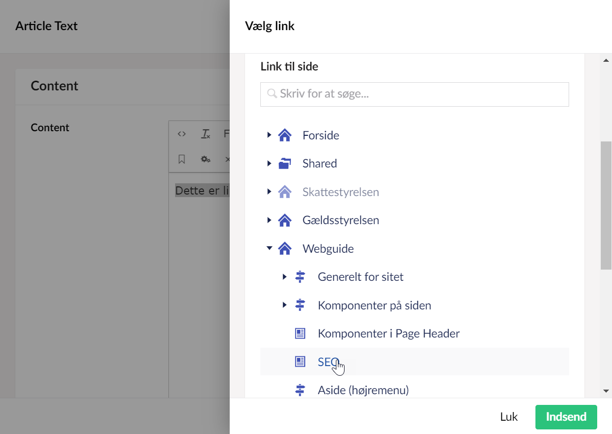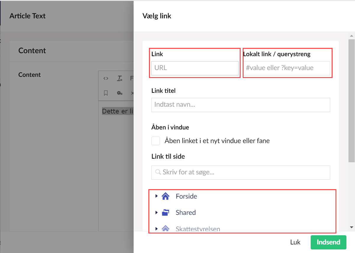 Siden "Vælg link" åbner. Du kan vælge mellem flere typer af links. Links til eksterne sider, anchor links og links til interne sider, som er de mest anvendte.
