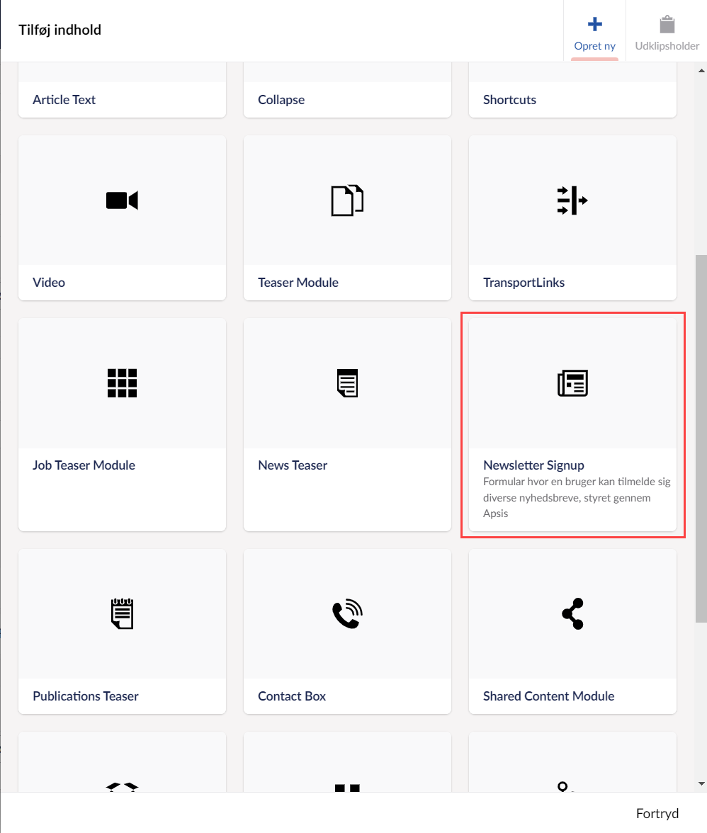 Brugere kan tilmelding sig nyhedsbrev (via Apsis).