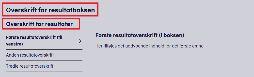 Den udfyldte overskrift vil vises til venstre, hvor der står 'Første resultatoverskrift (til venstre).' 'Indhold Overskrift' vil vises over det udfyldte indhold, hvor der står 'Første resultatoverskrift (i boksen)' (se billede forneden).