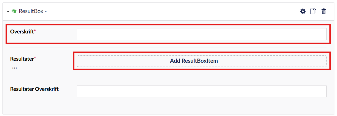En resultatboks skal indeholde en overskrift og en eller flere resultater. Dette tilføjes under 'Overskrift' og 'Resultater' ved at trykke på 'Add ResultBoxItem.'