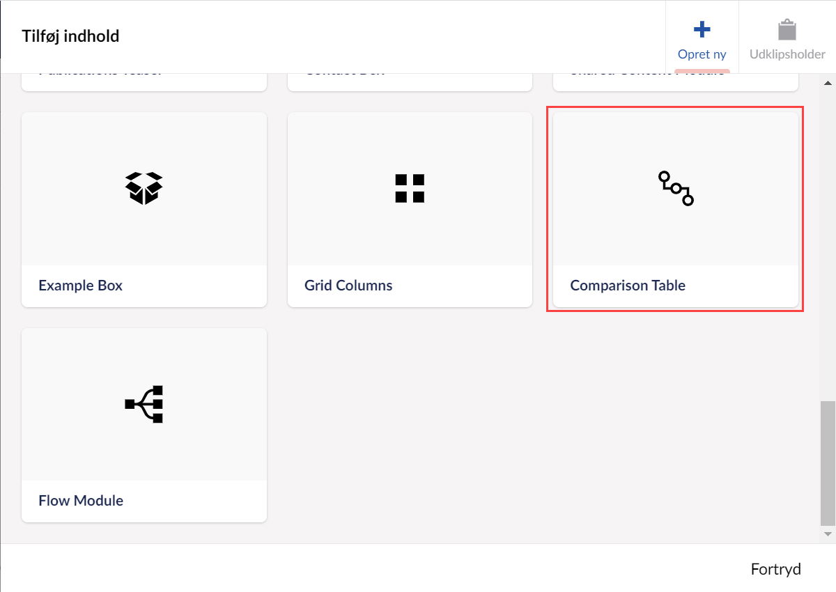 SammenligningstabelSammenligningstabel er en avanceret komponent, der bruges til at lave tabeller der... Nærmere forklaring vil følge senere Sådan gør du Opret sammenligningstabel Før du kan bruge en sammenligningstabel, skal du oprette xxx under delt indhold