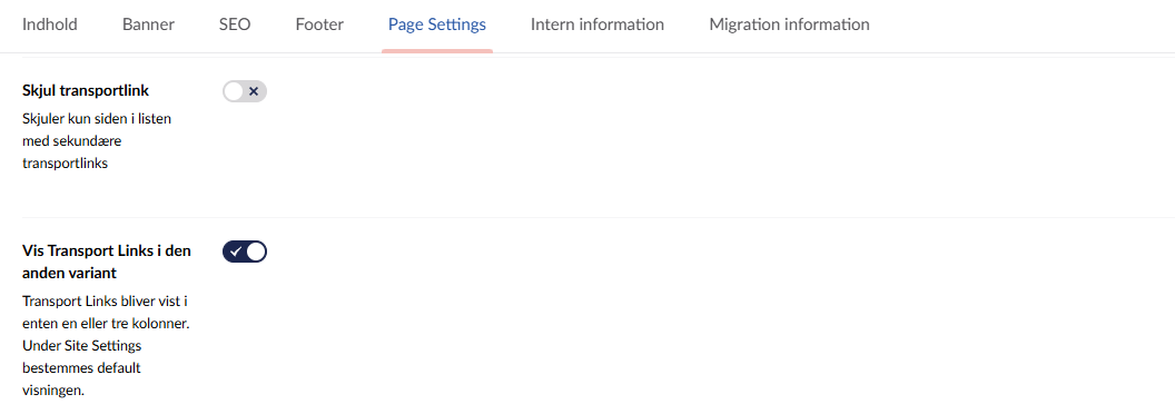 Dette kan overskrives på hver enkelt site - under Page Settings med knappen "Vis transportlinks i den anden variant".
