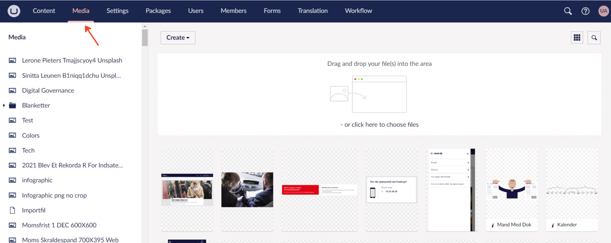 Samme metode for upload gør sig gældende for medie-filer; pdf'er, excel-ark, word-filer m.v.
