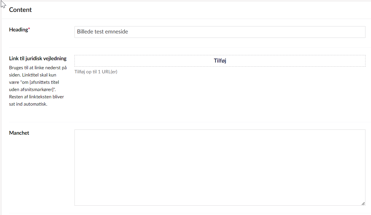 Området hvor redaktøren kan sætte indhold. Der er lidt færre komponenter der kan sættes ind i Content section på emnesider, end på tema- og transportside. Følgende kan benyttes: