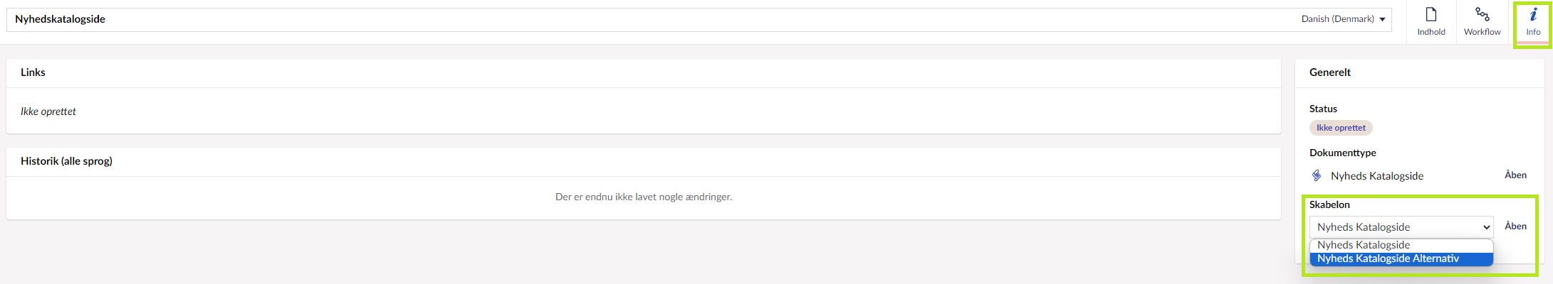 Når nyhedskatalogsien oprettes, er det vigtigt, at der under 'info' vælges 'Nyheds Katalogside Alternativ' som skabelon. Ligeså gælder dette, hvis der oprettes underliggende nyhedskatalogsider. Se nedenstående billede.
