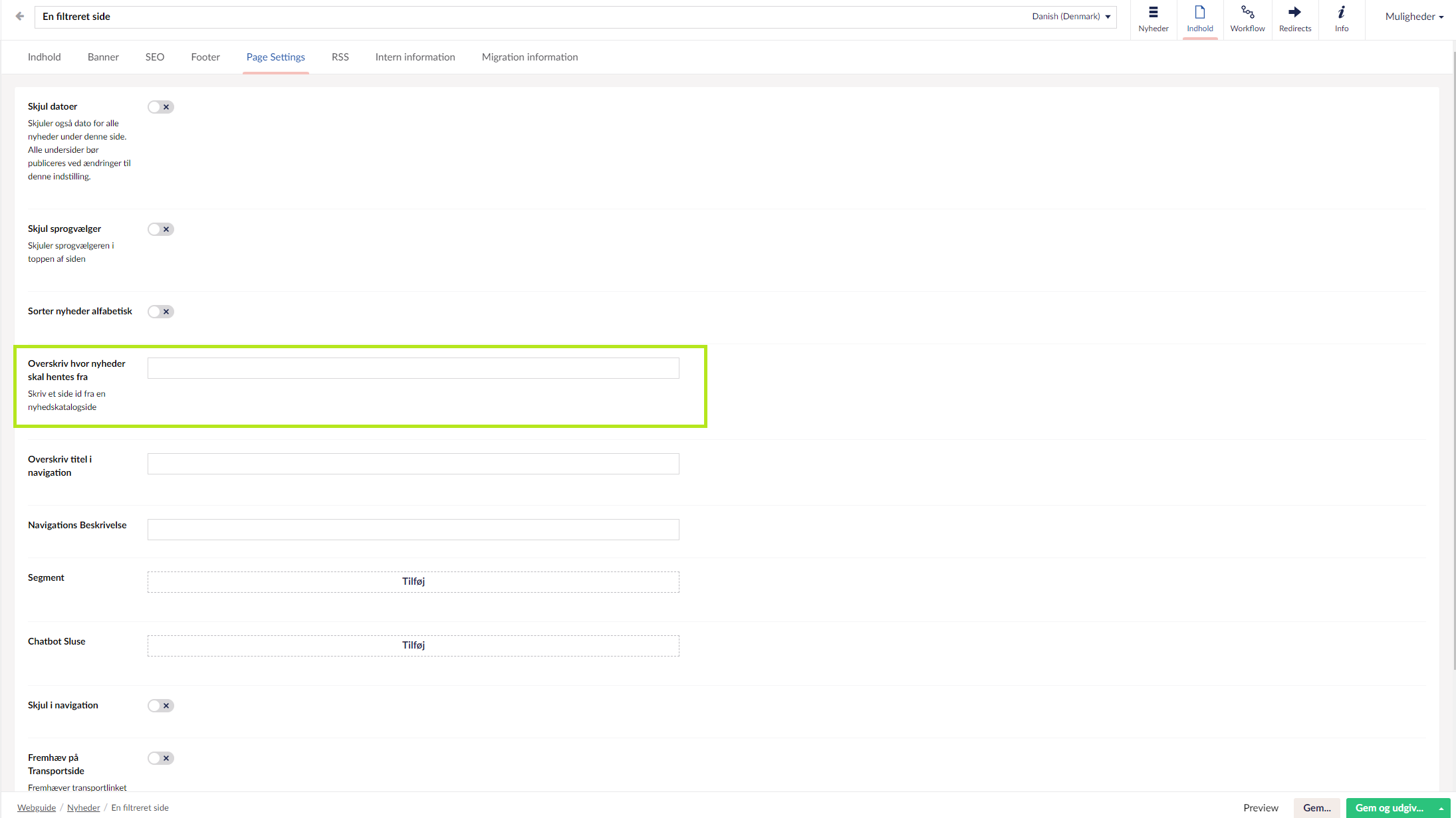 Siden udfyldes som en normal katalogside, men det er vigtigt, at der under 'page settings' ved 'Overskriv hvor nyheder skal hentes fra' indsættes id nummeret fra hovedkatalogsiden.