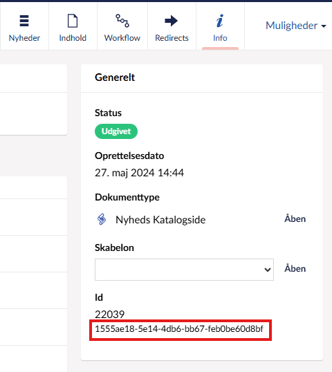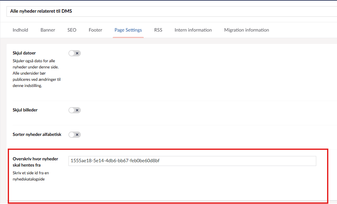 Man kan overskrive hvorfra nyhederne på en side kommer fra, ved at udfylde en setting med ID'et fra dem side, hvor nyhederne fremgår - se nedenstående billeder.