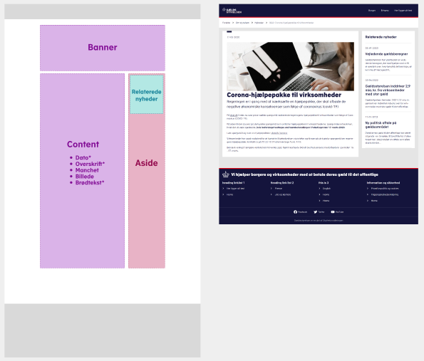 Sidetypen nyhedsside er delt op i områderne Banner, Content, Aside og Content Sections