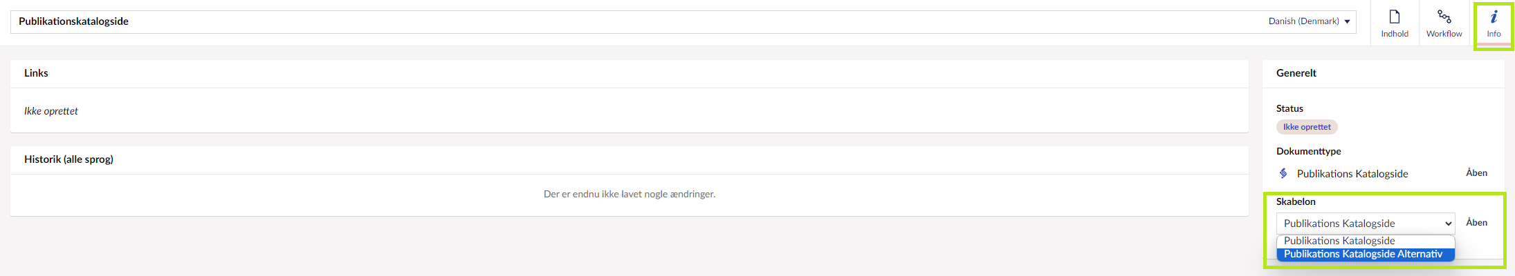 Når publikationskatalogsien oprettes, er det vigtigt, at der under 'info' vælges 'Publikations Katalogside Alternativ' som skabelon. Ligeså gælder dette, hvis der oprettes underliggende publikationskatalogsider. Se nedenstående billede.