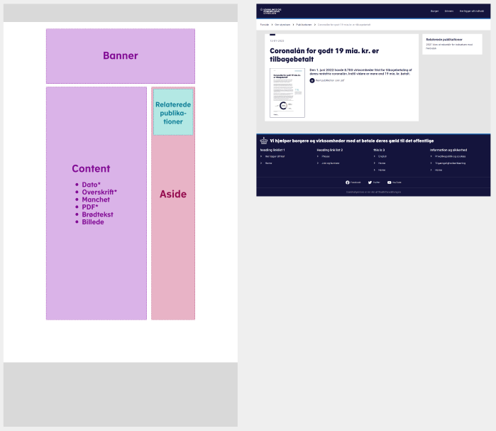 Sidetypen publikationsside er delt op i områderne Banner, Content og Aside.