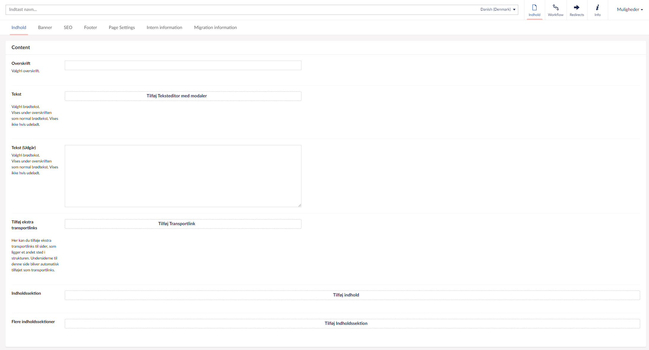 Det er muligt at oprette ekstra transportlinks til transportlinks-sektionen. De vil altid placeres efter de autogenerede transportlinks. Skal der laves om i denne rækkefølge, skal man ind på de underliggende sider under 'page settings' og trykke 'skjul i navigation', for derefter at tilføje dem som ekstra transportlink.