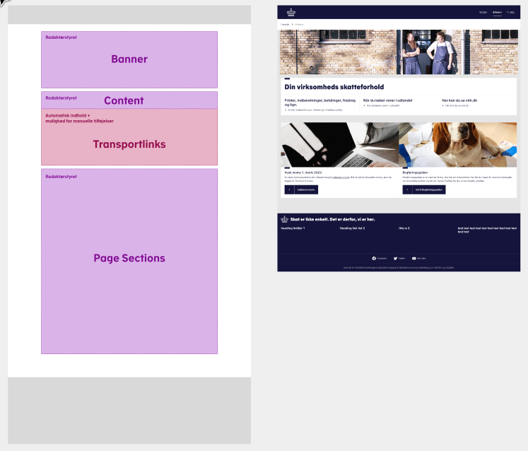 Sidetypen transportside er delt op i områderne Banner, Content og transportlinks og Content Section.