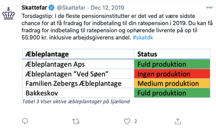 Tabellen i opslaget nedenfor lever op til tilgængeligskravene, da farverne alene fungerer som et supplement til tekster. Farveblinde kan derfor også afkode informationen.